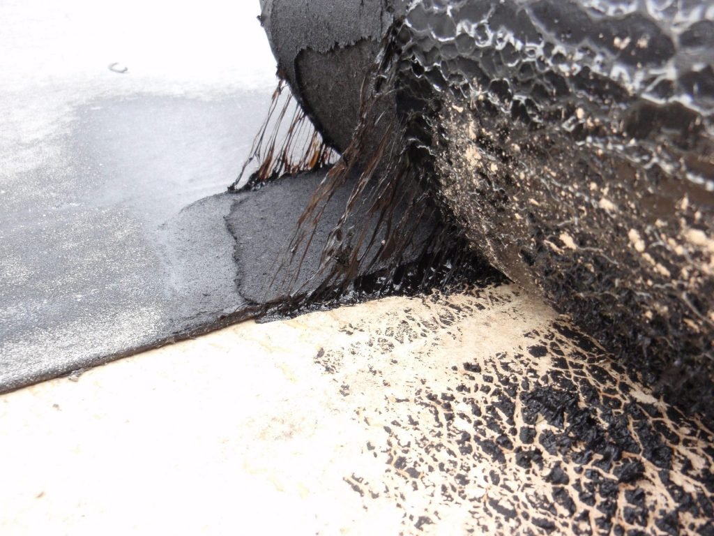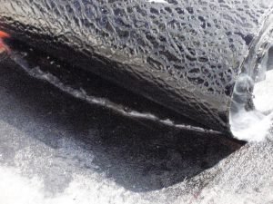 During proper heat application of torch applied membrane, the roll can be rolled back and “stringers” of modified asphalt can be observed. This is an indicator of adequate heat at the point of application.