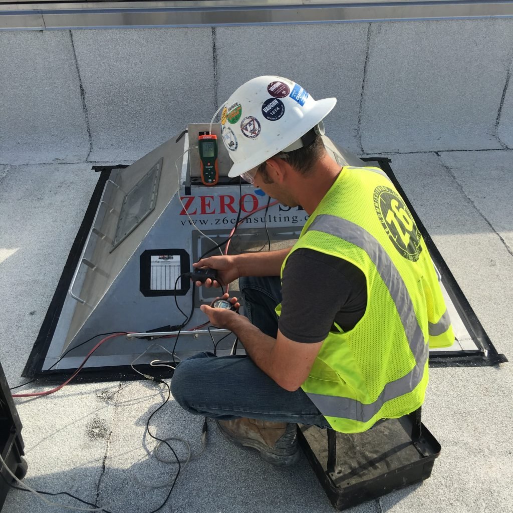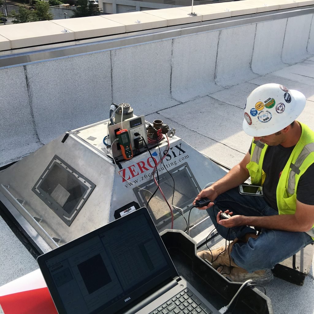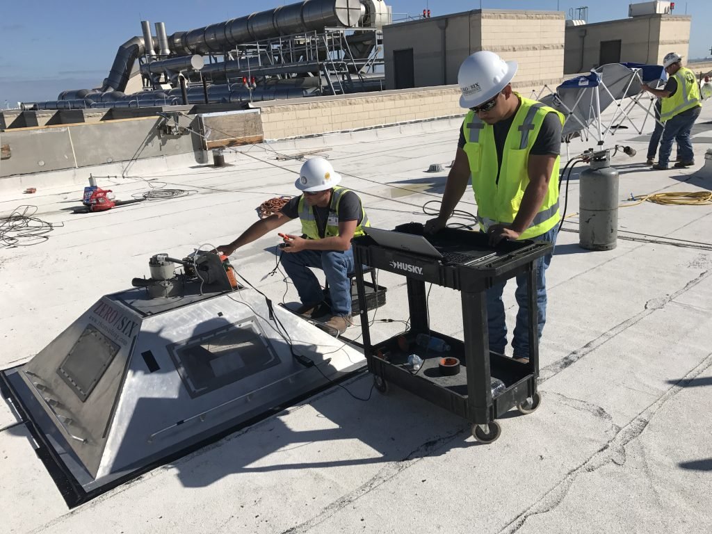 Z6 set out to be the leader in roof uplift testing by building our own improved version of a typical testing chamber. Uplift testing used to be referred to as “bubble test” as it was often conducted with a high-strength skylight dome. FM Global was on hand during our “maiden voyage” and was so impressed with our chamber design; they suggested we put the system on the market. Z6 built our roof uplift chamber with the mindset of eliminating the controversial “spiking” test pressures issue. We do this by showing the readings for pressure and deflection in a real-time computer generated graph during the test and on the report. Our custom roof uplift chamber, calibrated tooling and extensive protocols evaluate and record pressure and deflection measurements in real-time.
